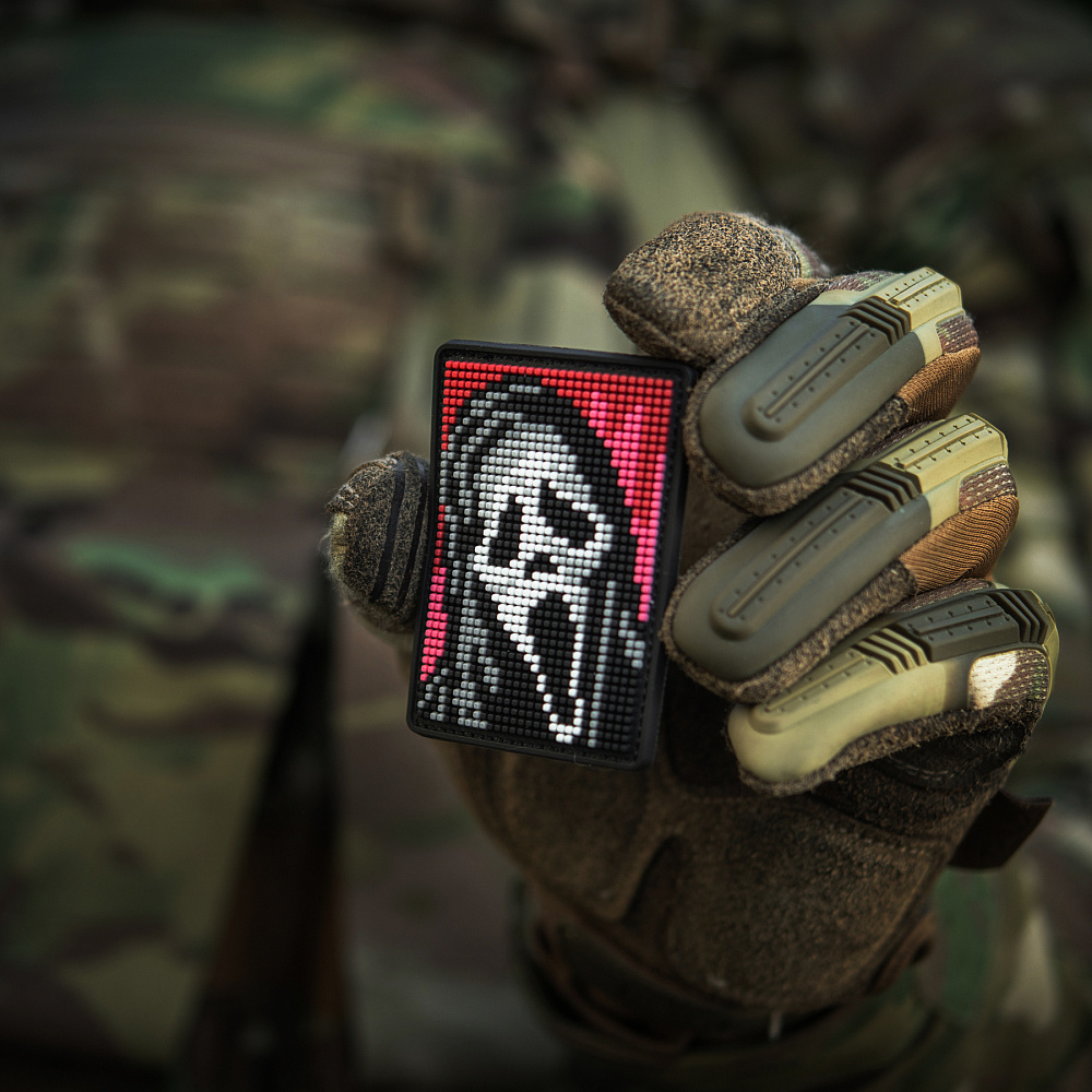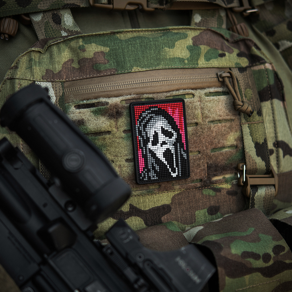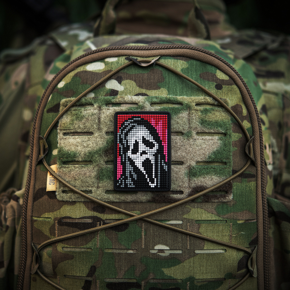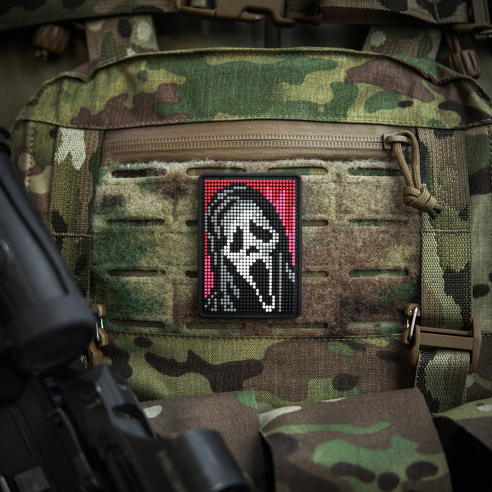 На патчі розміщено центральний елемент серії горор-фільмів – маску Ghostface (з англ. – Примарне обличчя), створену на основі картини “Крик” Едварда Мунка. Зображення виконано у стилі піксельної графіки, яка широко використовувалась у минулому сторіччі для створення відео-ігор, а на сьогодні – є впізнаваним видом цифрового мистецтва.