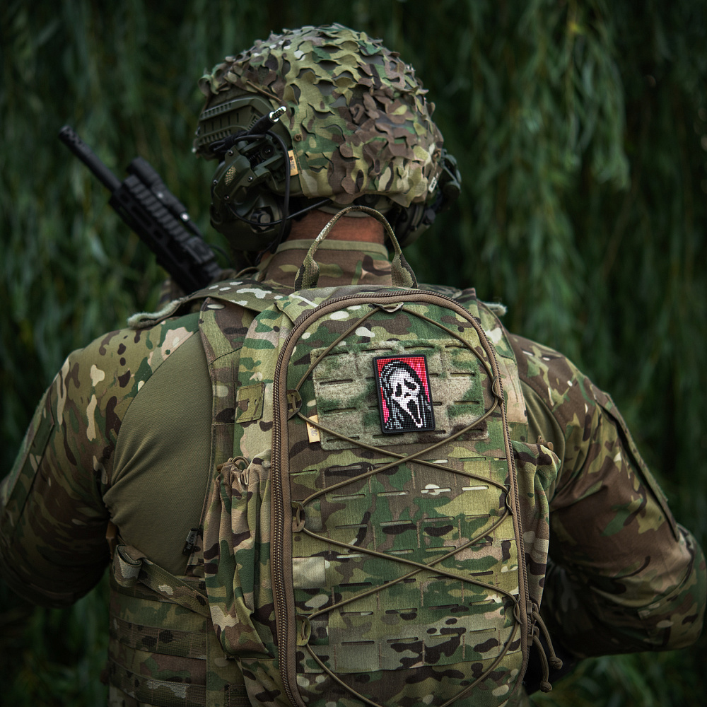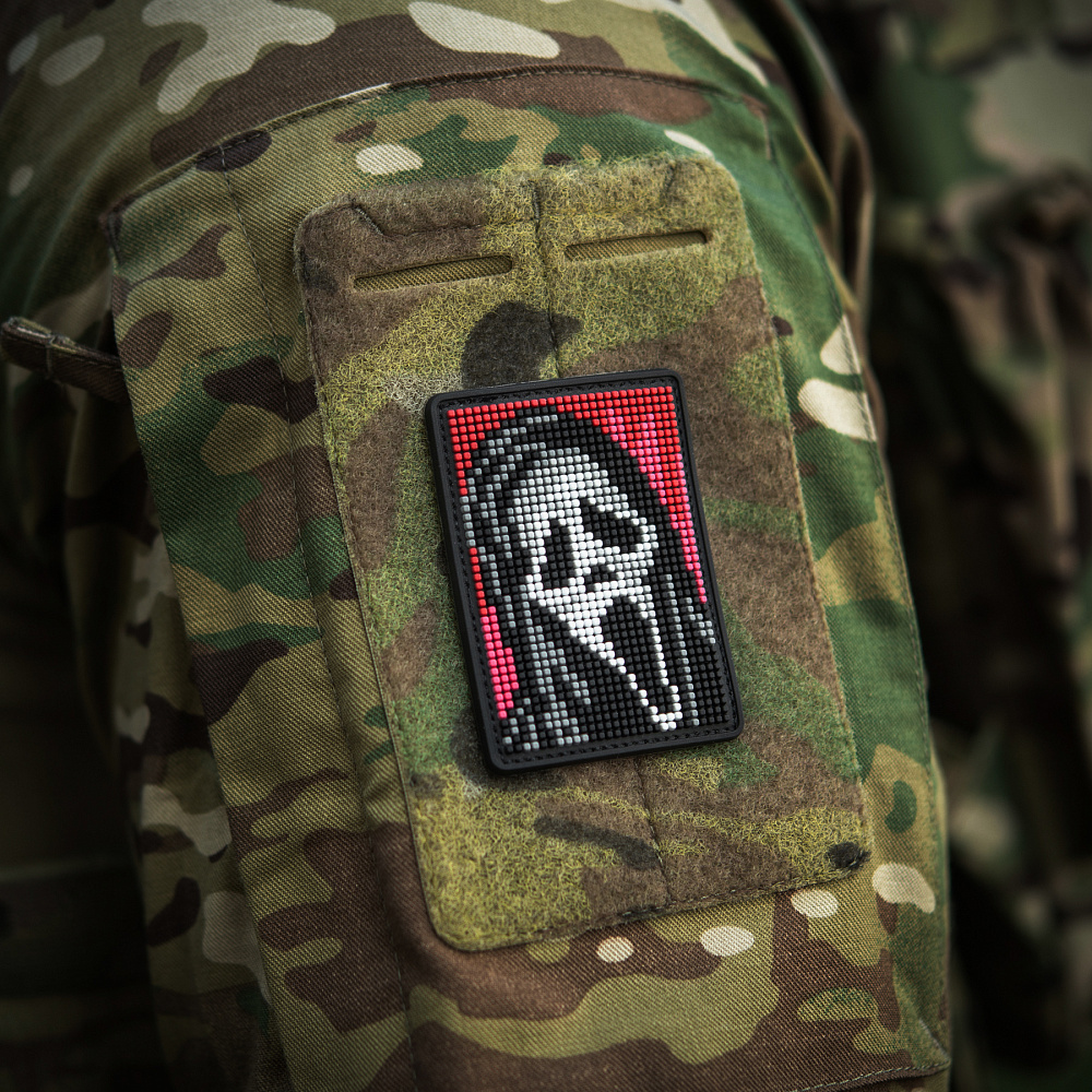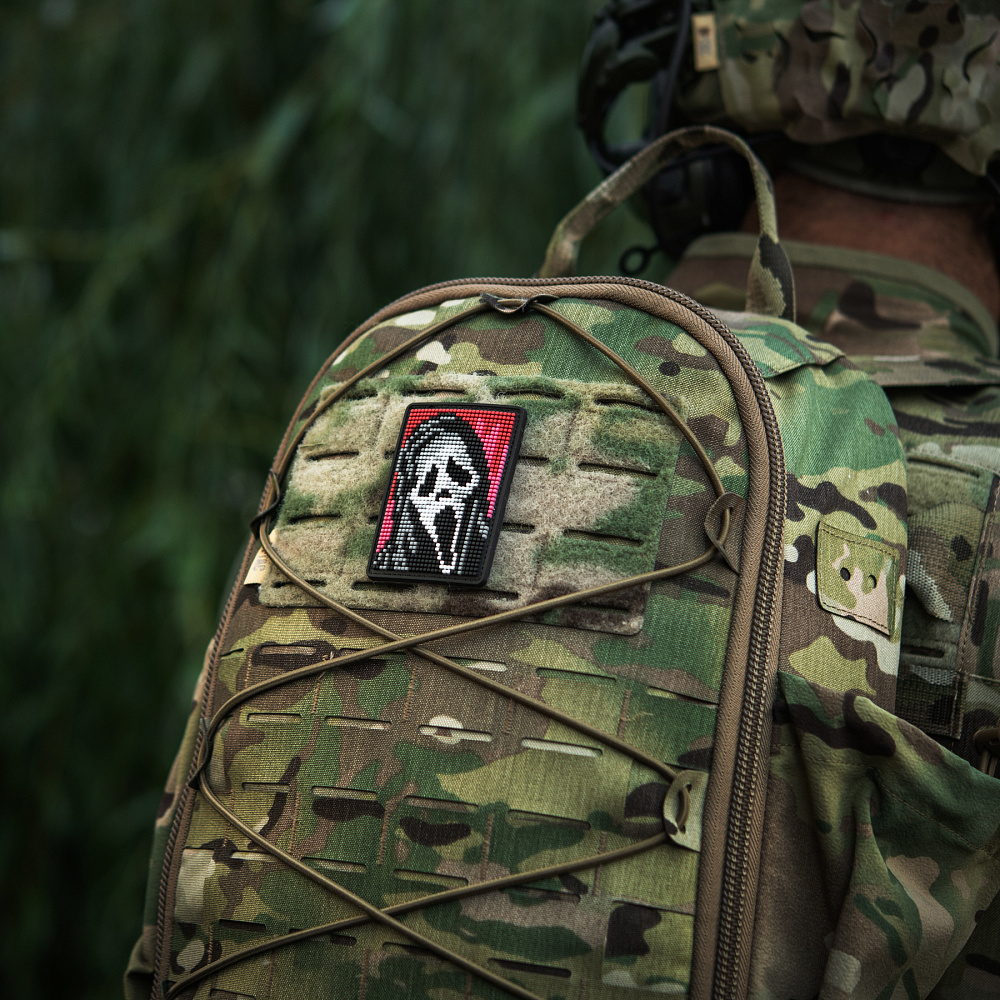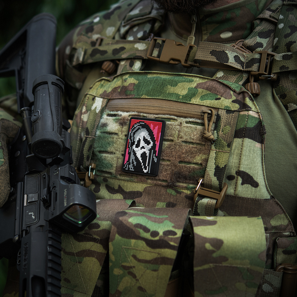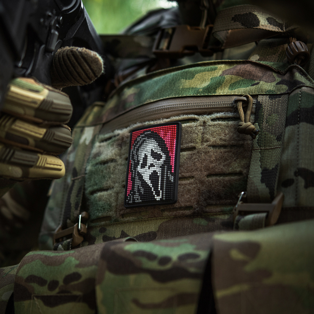 На патчі розміщено центральний елемент серії горор-фільмів – маску Ghostface (з англ. – Примарне обличчя), створену на основі картини “Крик” Едварда Мунка. Зображення виконано у стилі піксельної графіки, яка широко використовувалась у минулому сторіччі для створення відео-ігор, а на сьогодні – є впізнаваним видом цифрового мистецтва.