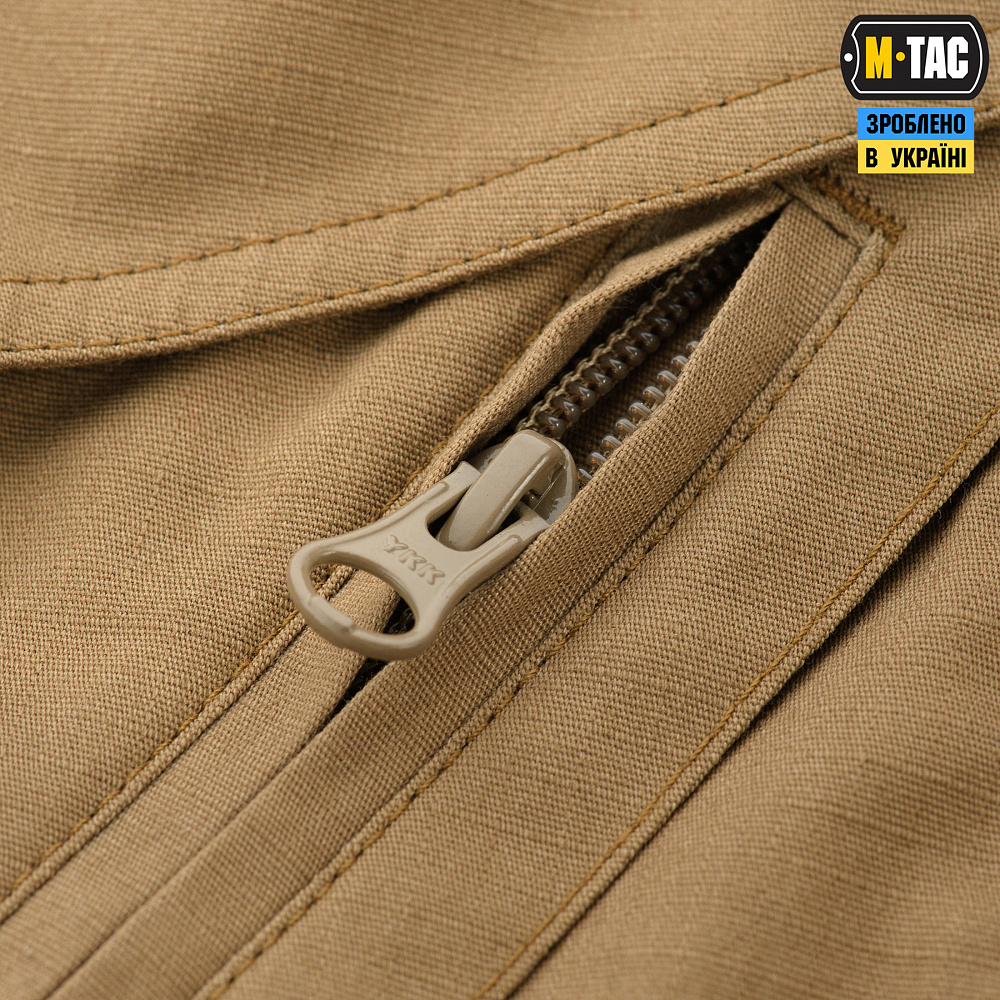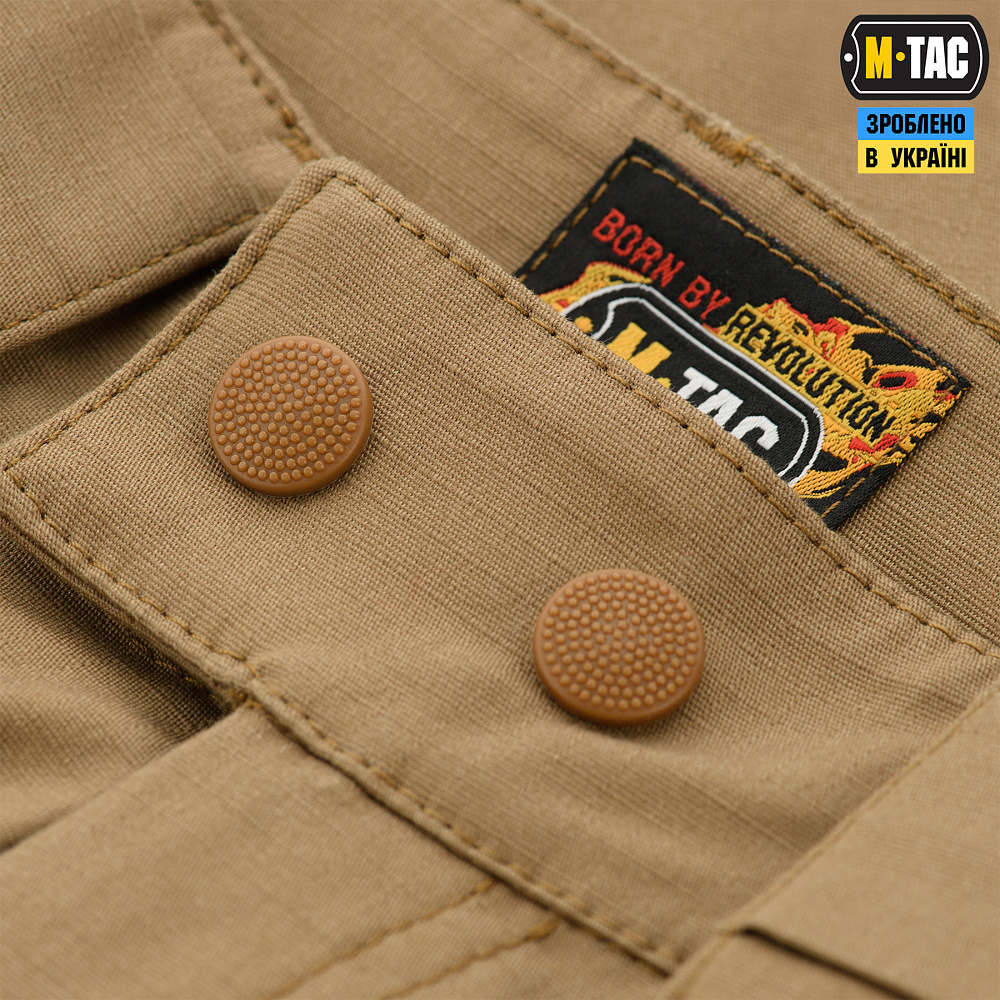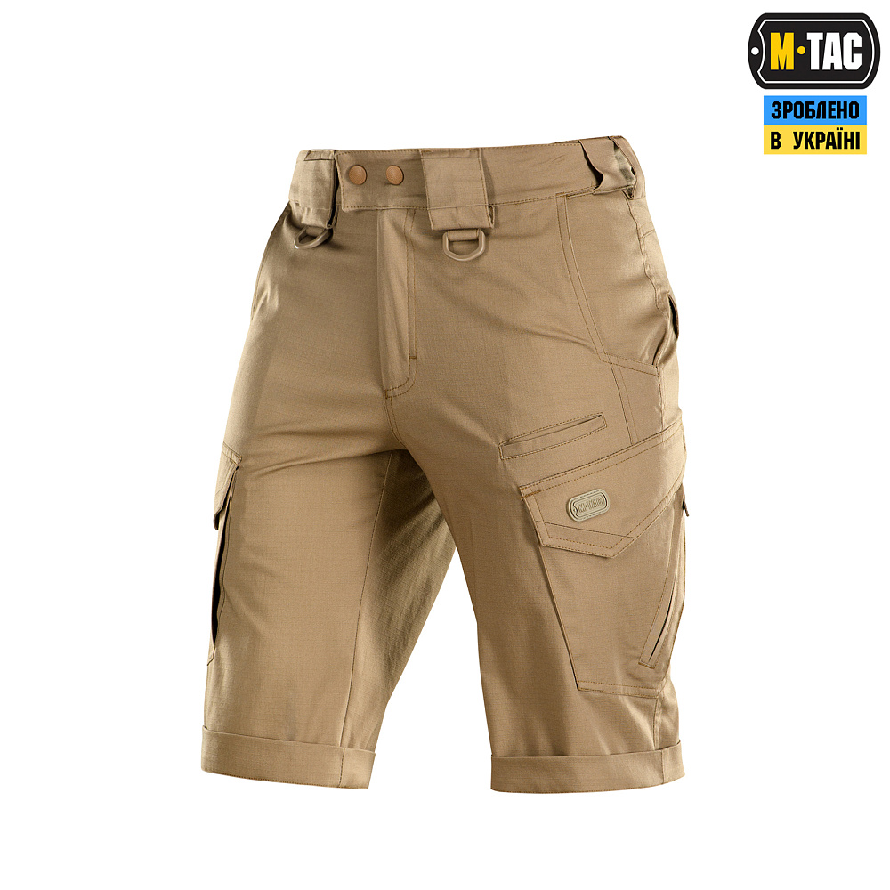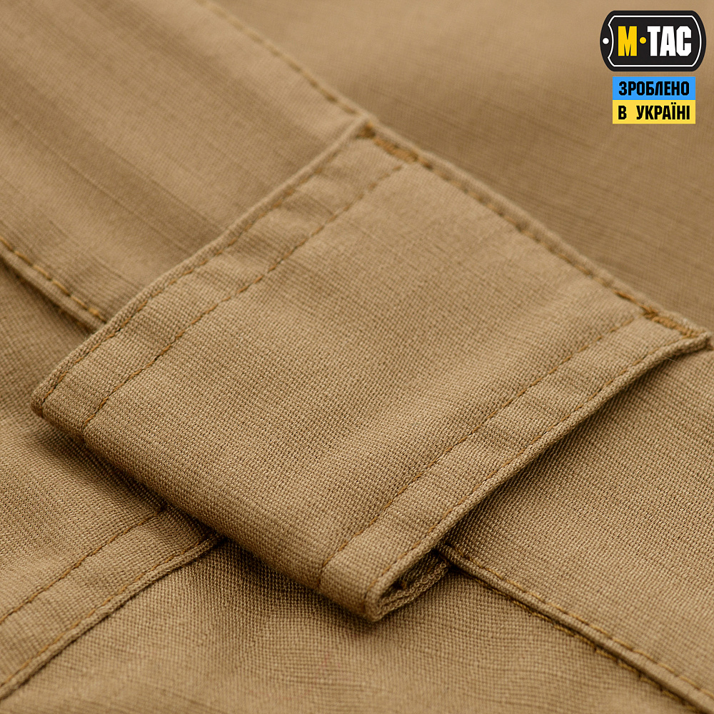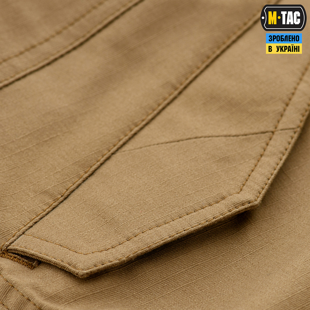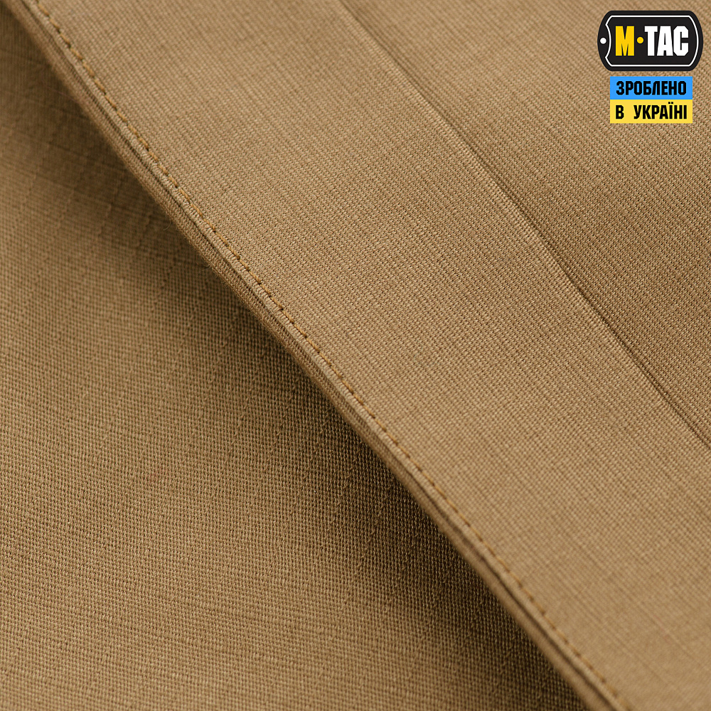 Вітчизняний бренд M-Tac намагається вносити інноваційні технології на ринок. Пошито шорти з легкої, однотонної тканини рипстоп, з водо- і брудозахисним просоченням Teflon. Склад:бавовна, поліестер і спандекс. Тканина з вмістом поліестеру і бавовни приємна до тіла, добре тримає колір і відрізняється високою міцністю.
