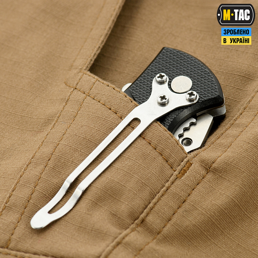 Зручні широкі кишені з посиленими вставками. Шорти розраховані на носіння з ременем шириною до 5.5 сантиметрів. Спереду на кріпленнях для ременя нашиті пряжки для кріплення чого завгодно (за допомогою карабінів). Якісна фурнітура від компанії YKK.