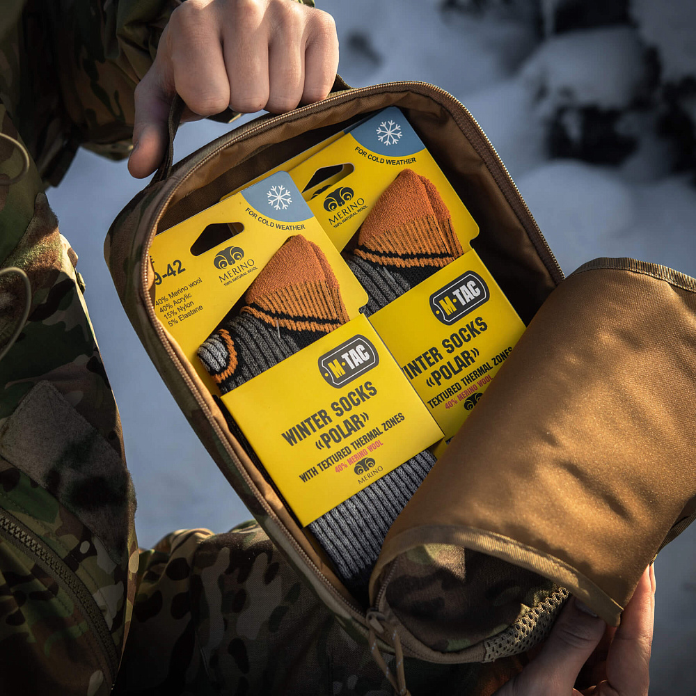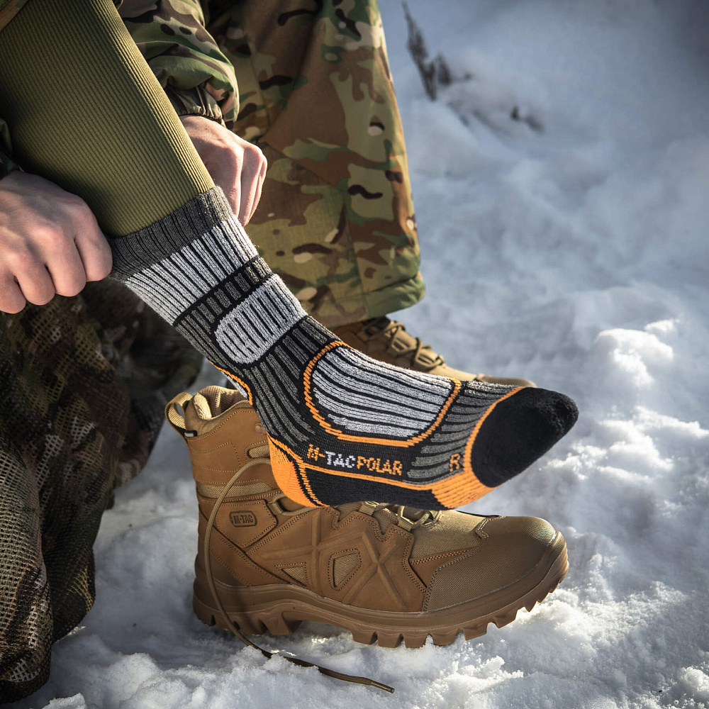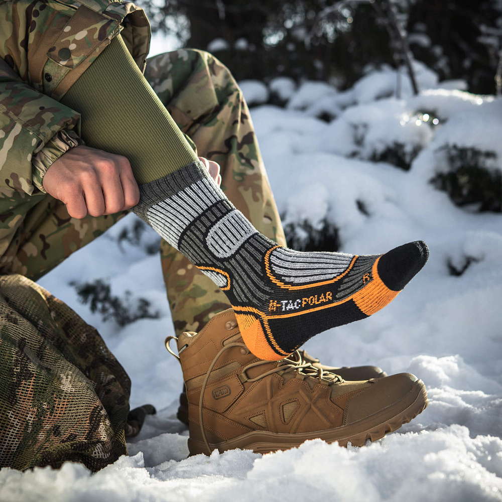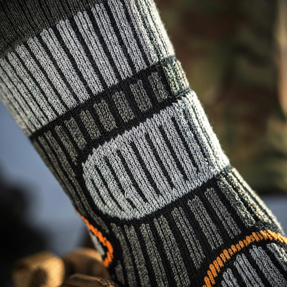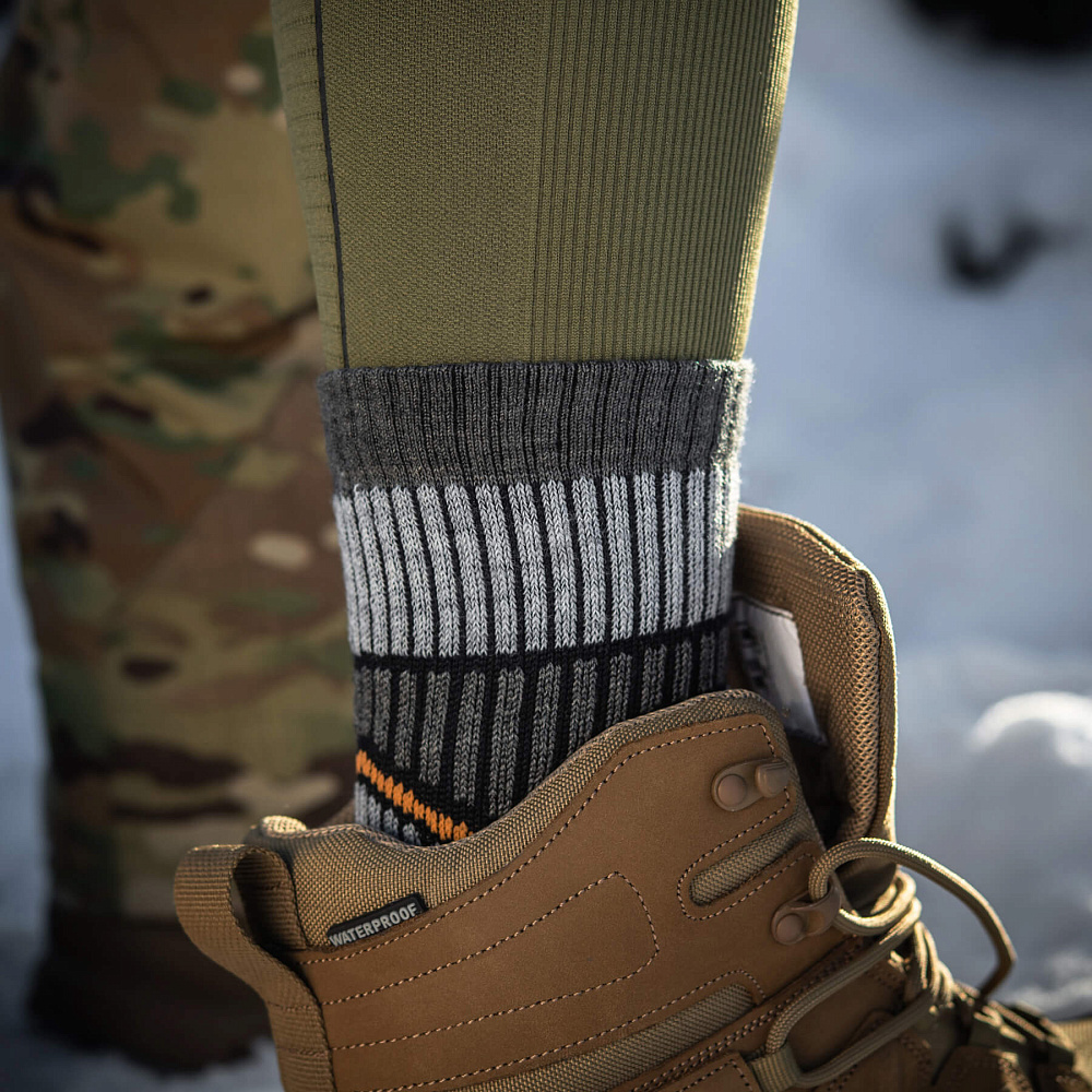 Компанія М-Тас пропонує чоловікам придбати зимові шкарпетки, призначені для активного відпочинку і виконання тактичних завдань. Модель виготовлена з вовняного волокна, що володіє відмінними теплоізоляційними властивостями, тому шкарпетки витримують мороз до -15 градусів. Завдяки властивості вбирання вологи, шкарпетки можуть використовуватися і в літній період - ноги в них завжди залишаються сухими.