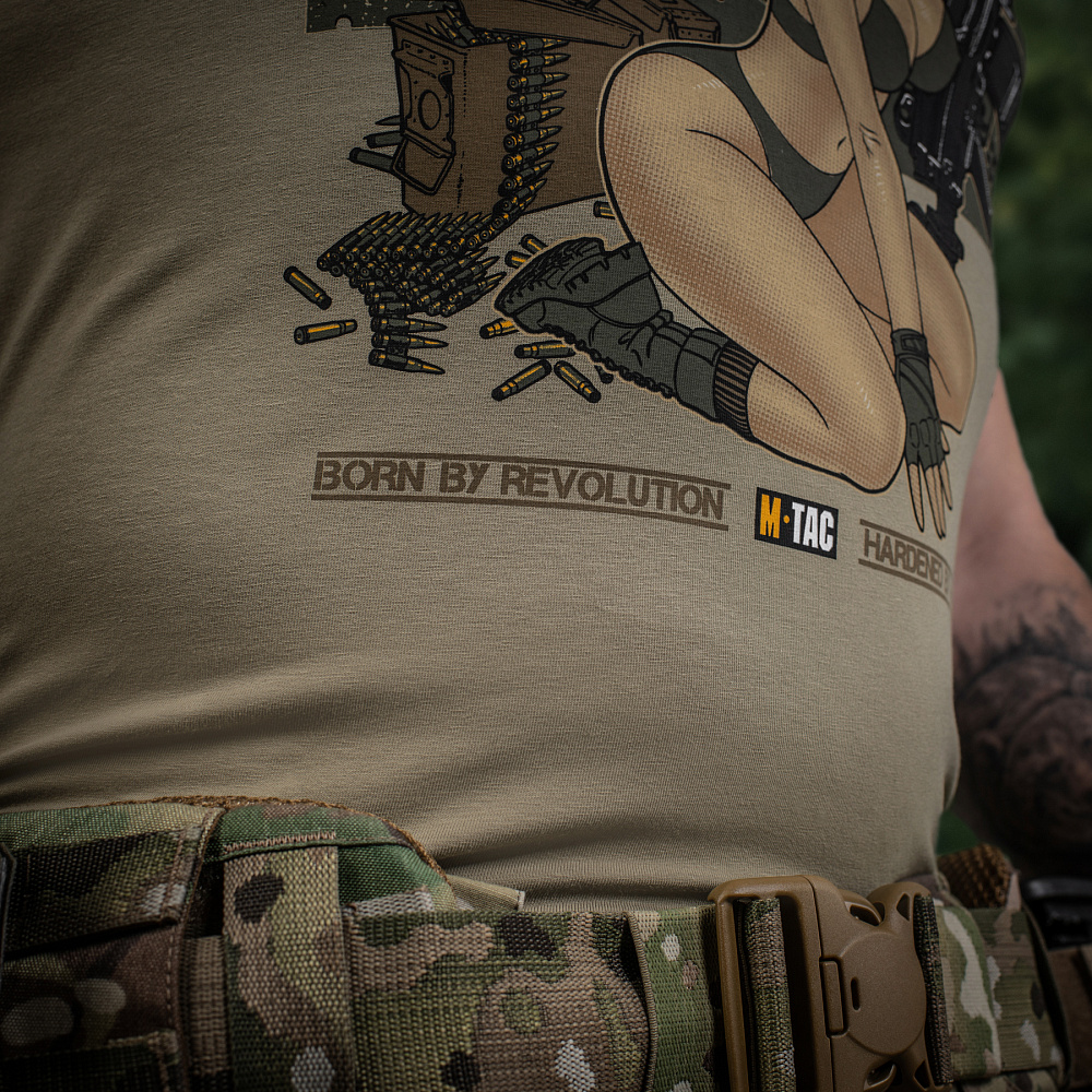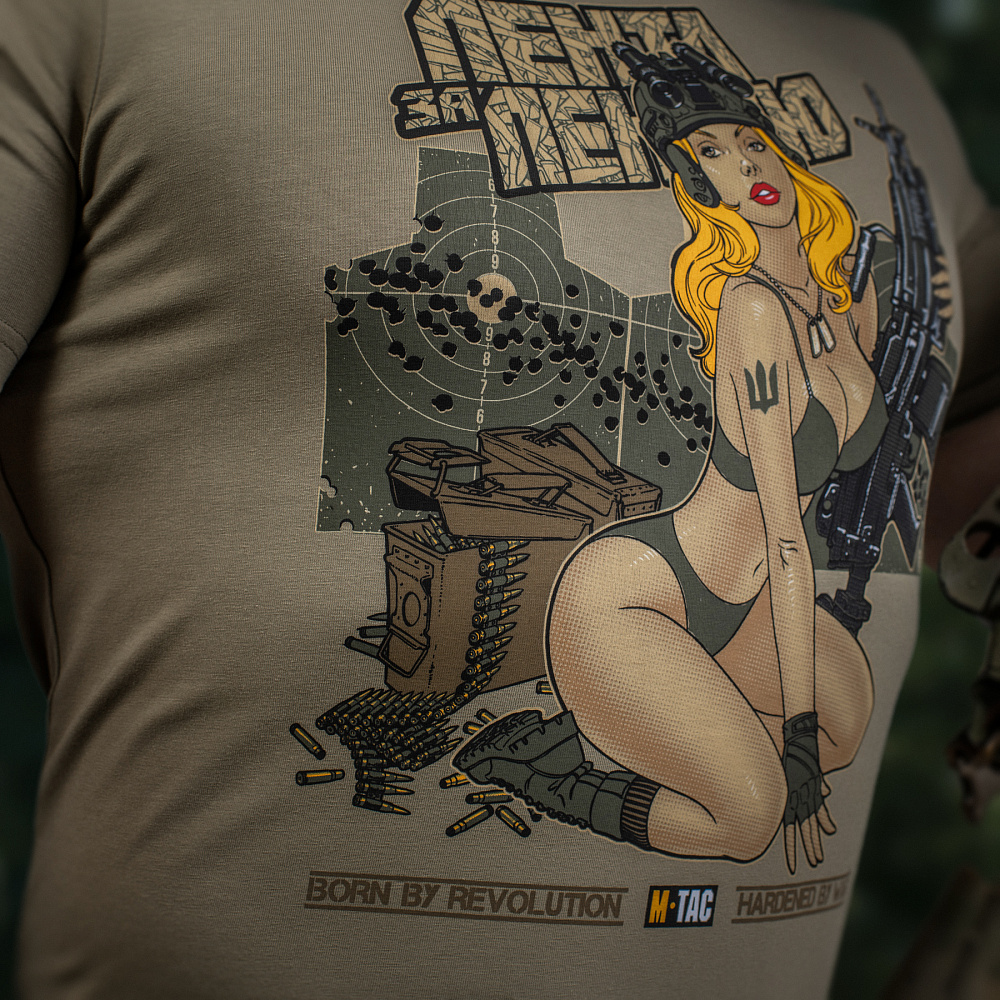 На принті зображена приваблива дівчина в стилі Pin-Up, що є уособленням краси та сили характеру. Зверху принта розміщений напис “Лента за лентою” - слова з відомої пісні, що стала символом незламності українського визвольного руху. Так само як і в пісні, дівчина тримаючи в своїх руках кулемет М249, готова зайняти місце пораненого воїна, аби завдати нищівного удару противнику.