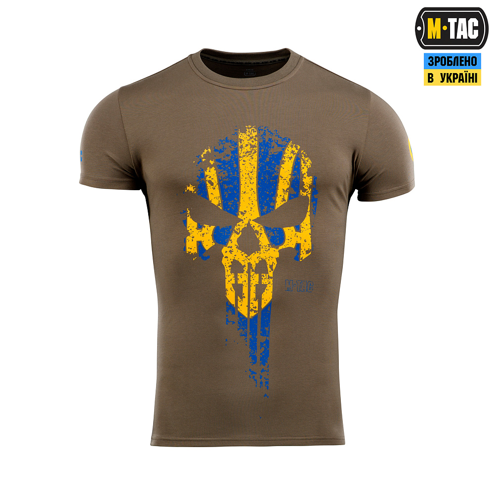 На передній частині футболки - стилізований череп «Punisher» синього кольору, на якому чітко проглядається зображення державного герба України - Тризуба, виконаного жовтим кольором. І непомітний логотип M-TAC (Синім). Таким чином забарвлення принта викликає асоціації із державним українським прапором.