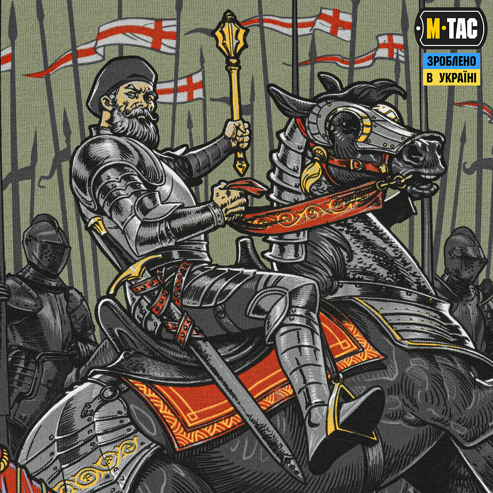 Саме він зображений в центрі принта на коні, в латах із символом влади у руках - булавою. Полководець знаходиться в оточенні інтернаціонального кінного та пішого війська Великого князівства Литовського і Речі Посполитої, які об’єдналися проти загарбників.