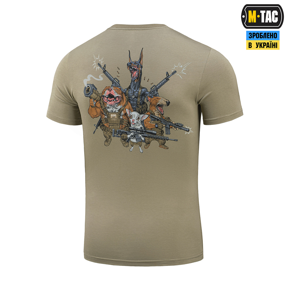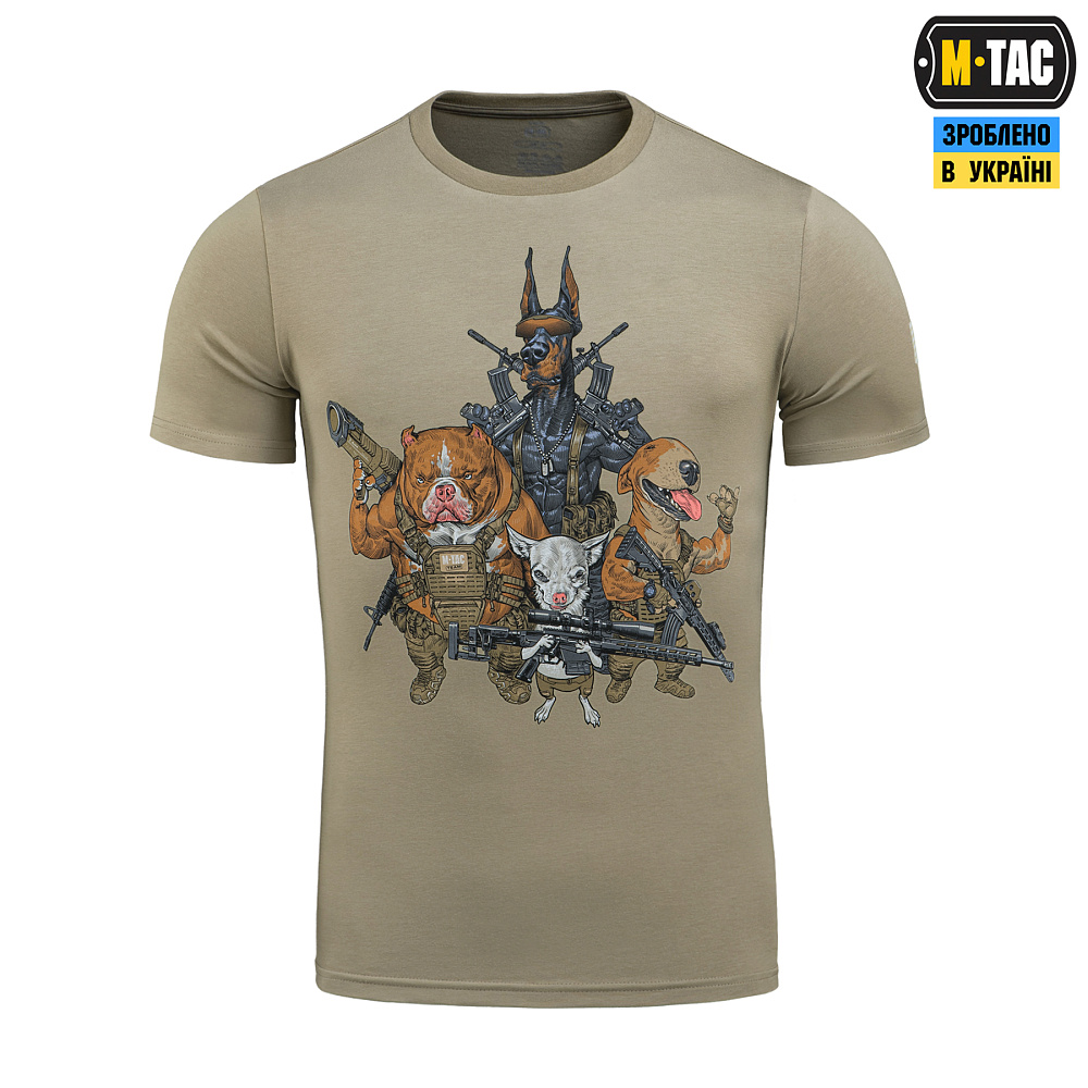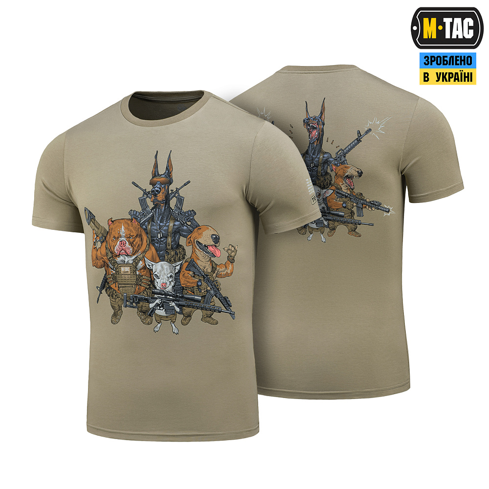 Спереду футболки зображена команда із чотирьох собак, екіпірованих та озброєних, як військові. Троє з них виглядають досить кремезними. Позаду стоїть доберман з двома автоматами, а з боків — бульдог з гранатометом та бультерʼєр з гвинтівкою.