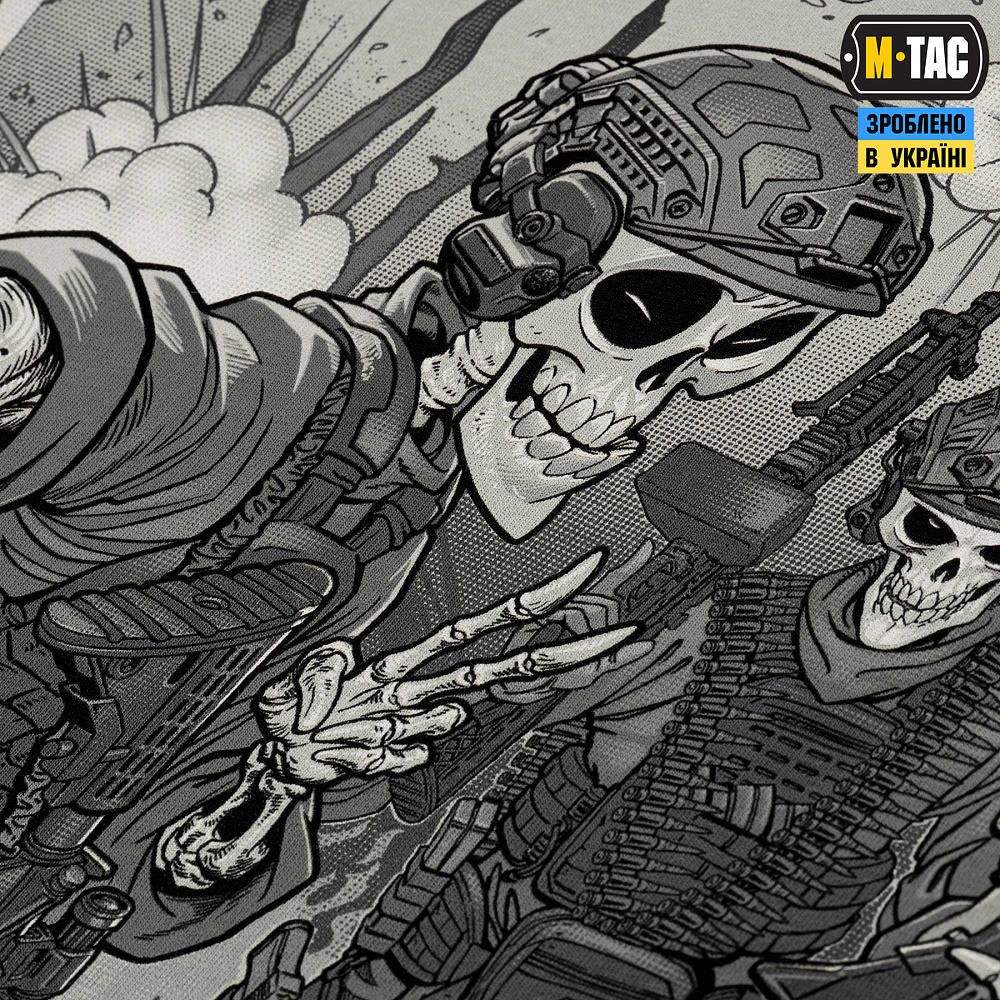 Принт на футболці створений як стилізація полароїдного фото, зробленого під час бойових дій. На знімку троє побратимів, які разом проходять крізь найважчі випробування війни. Ця фотокартка, зім’ята, подряпана, з явними слідами часу і фронтової реальності, стала візуальним символом незламності. У ній закарбувалася не просто мить на фоні запеклого бою, а цілий пласт відчуттів — втома, напруга, внутрішня зібраність і рішучість. Вона промовляє про стан, коли фізичні сили на межі, але воля до опору не вичерпується. У цьому зображенні мовчазне свідчення щоденної боротьби, яку ведуть наші воїни.