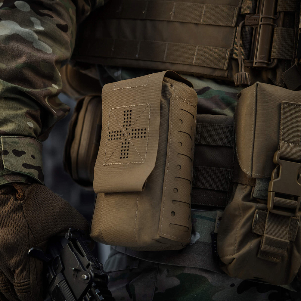 Зовнішній підсумок та внутрішній органайзер виготовлений із Cordura 500D – міцного матеріалу, стійкого до стирання та високих навантажень. Внутрішні бічні стінки обладнані нейлоновою стропою, завдяки якій підсумок добре тримає форму. Додатковим фіксуючим елементом є стяжка, яка дає змогу надійно утримувати аптечку. Підсумок кріпиться до спорядження за допомогою MOLLE інтерфейсу, виконаного за технологією Laser Cut.