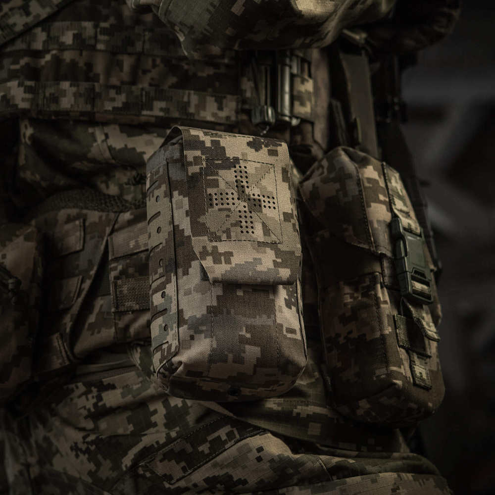 Зовнішній підсумок та внутрішній органайзер виготовлений із Cordura 500D – міцного матеріалу, стійкого до стирання та високих навантажень. Внутрішні бічні стінки обладнані нейлоновою стропою, завдяки якій підсумок добре тримає форму. Додатковим фіксуючим елементом є стяжка, яка дає змогу надійно утримувати аптечку. Підсумок кріпиться до спорядження за допомогою MOLLE інтерфейсу, виконаного за технологією Laser Cut.