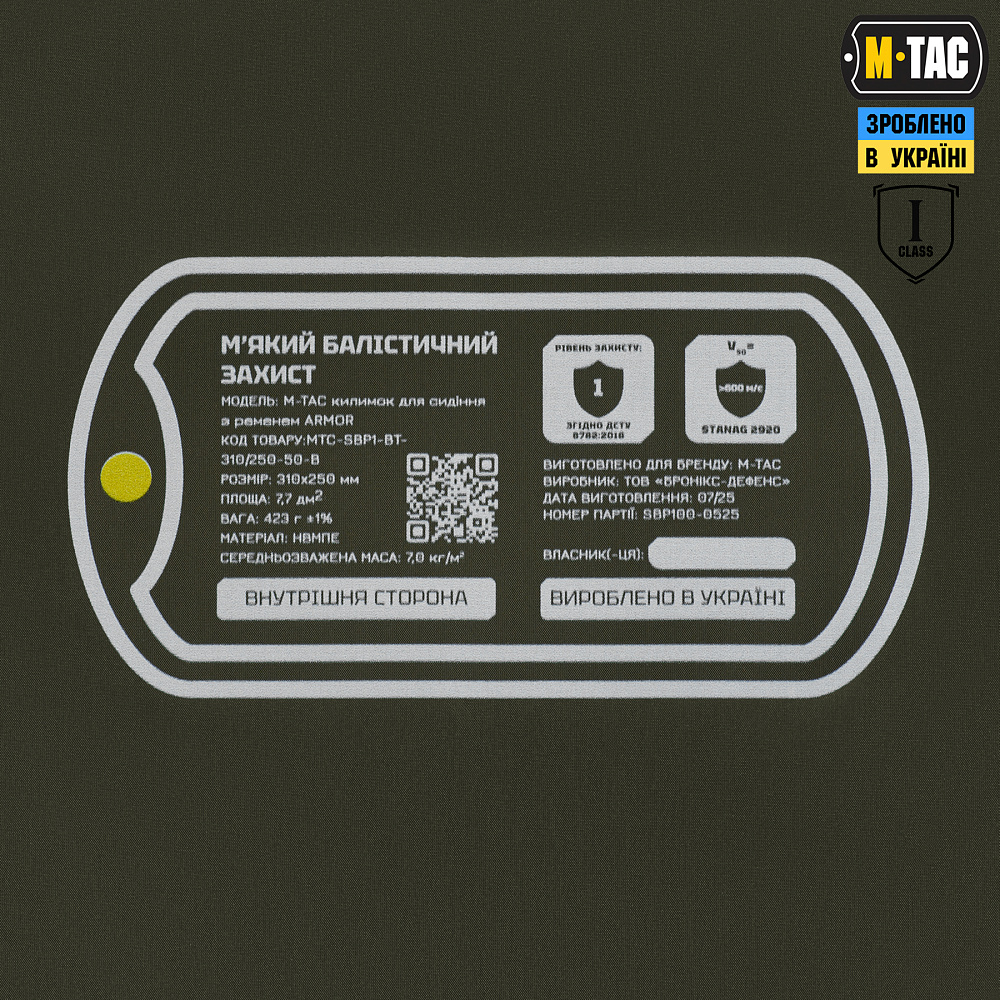 M-TAC БАЛІСТИЧНИЙ ПАКЕТ 1 КЛАС (BRONYX) В КИЛИМОК ДЛЯ СИДІННЯ З РЕМЕНЕМ ARMOR розроблений спеціально для M-Tac килимка для сидіння з ременем Armor та призначений для додаткового захисту від рикошетів й уламків.