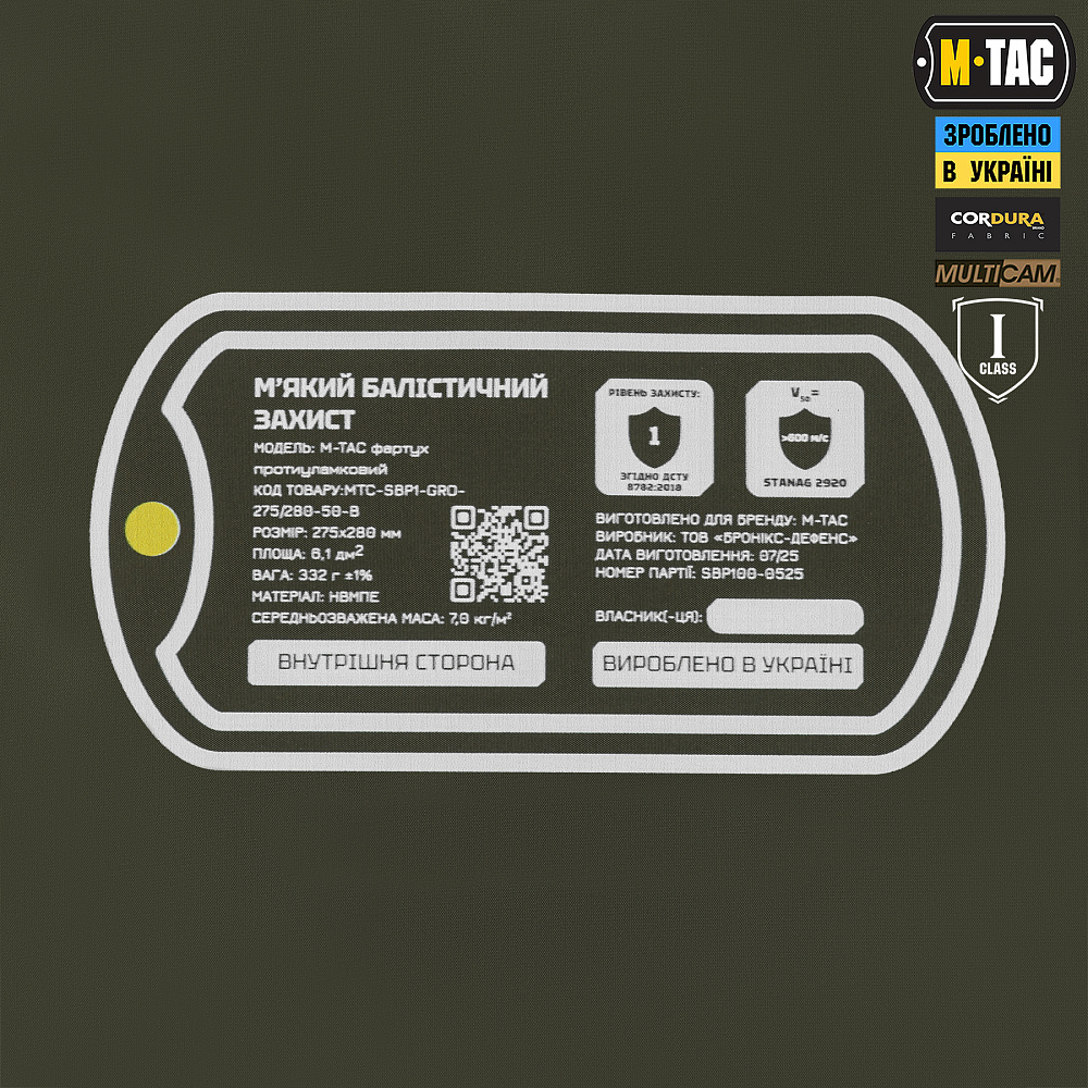 M-Tac фартух протиуламковий з балістичним пакетом 1 клас (BRONYX) Laser Cut сумісний з: