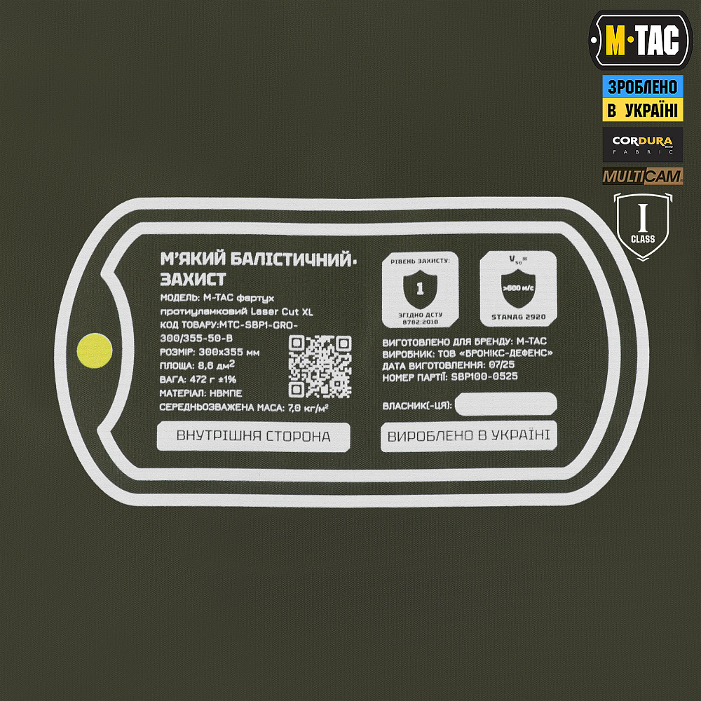 M-Tac фартух протиуламковий з балістичним пакетом 1 клас (BRONYX) Laser Cut XL сумісний з: